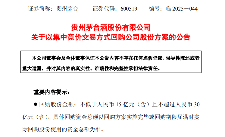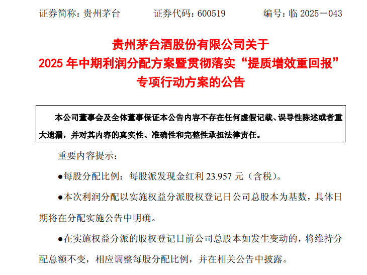 贵州茅台(600519)(600519)今日晚间发布公告,披露2025年中期利润分配方案及以集中竞价交易方式回购公司股份方案,同时明确多项“提质增效重回报”举措,以兼顾公司发展与投资者利益。