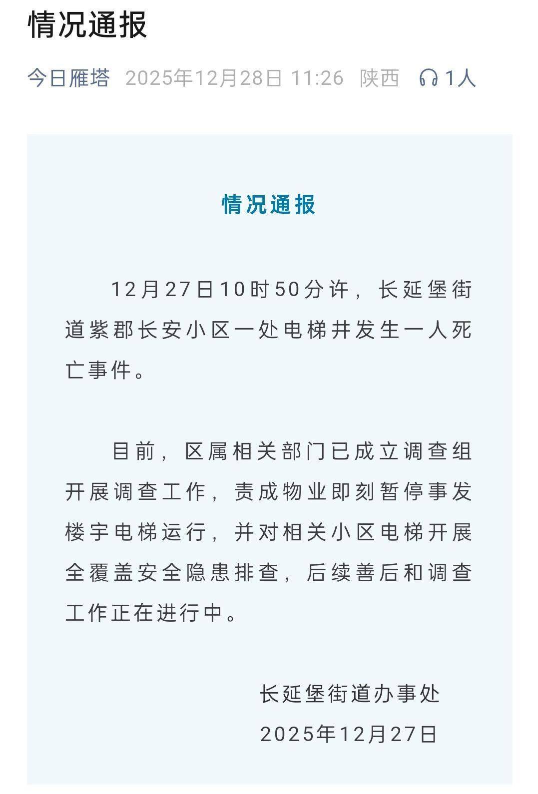 12月28日源顺网,西安雁塔通报一小区电梯井发生一人死亡事件,已成立调查组开展调查工作,详情如下: