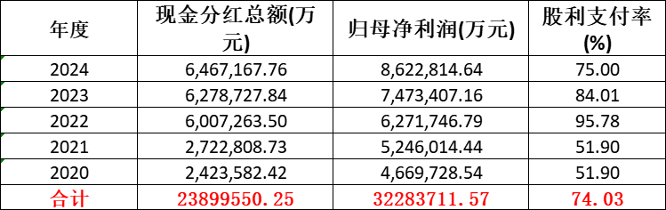作为A股“白马股”代表,贵州茅台长期保持大手笔现金分红传统。数据显示,2020年—2024年,贵州茅台现金分红合计2389.96亿元,占同期公司归母净利润总和的74%。